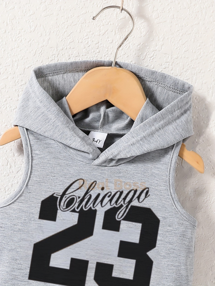 Boys' Summer Hooded Fashion Simple Popular Chicago 23 Print Shorts Set, for Outdoor, Sleeveless, Casual Summer Outfit, Lightweight Polyester Blend, Easy Care